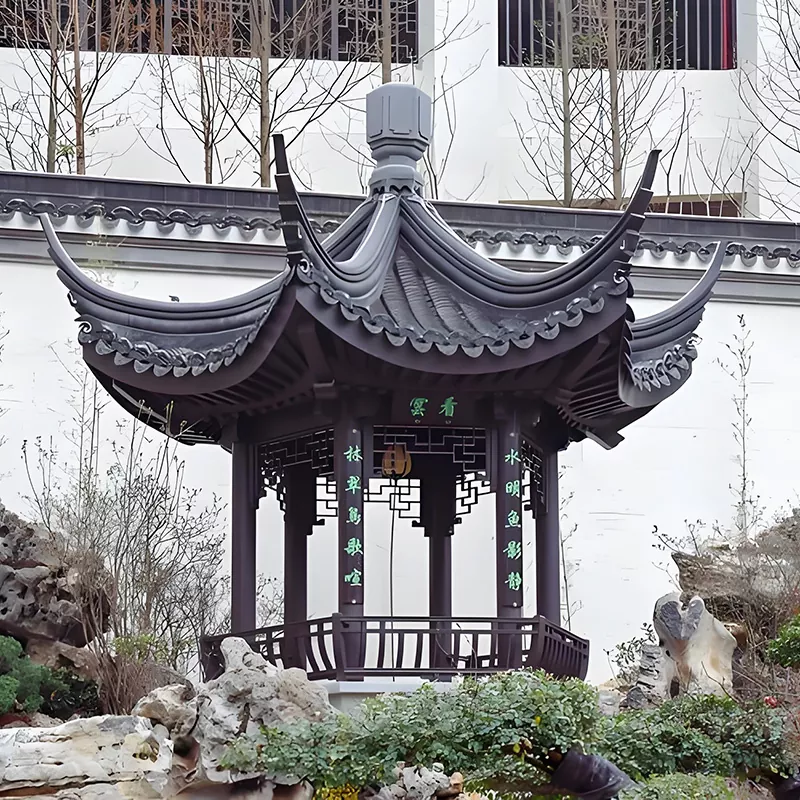 প্রাচীন আর্কিটেকচার রিপ্রোডাকশন প্যাভিলিয়ন (5000×5000mm): 120×120mm পুরু কলাম, বন্ধনীর কাঠামো, ওপেনওয়ার্ক খোদাই করা ঝুলন্ত জালি, সাংস্কৃতিক স্থান এবং মনোরম স্থানগুলির মূল এলাকাগুলির জন্য উপযুক্ত।